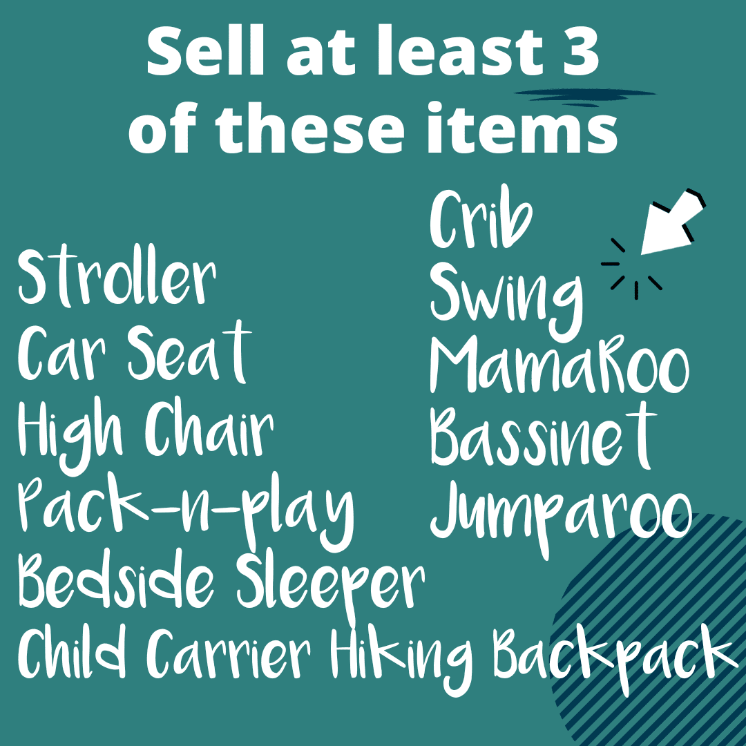 All items must pass safety and recall inspection, be clean, and be in great condition. The total of the 3 items' tagged prices must equal to at least $100 to qualify for the bonus. You will only receive the BONUS if at least 3 of your qualifying items are SOLD at our sale. Verification of your qualifying items sold will be done after the sale is over.